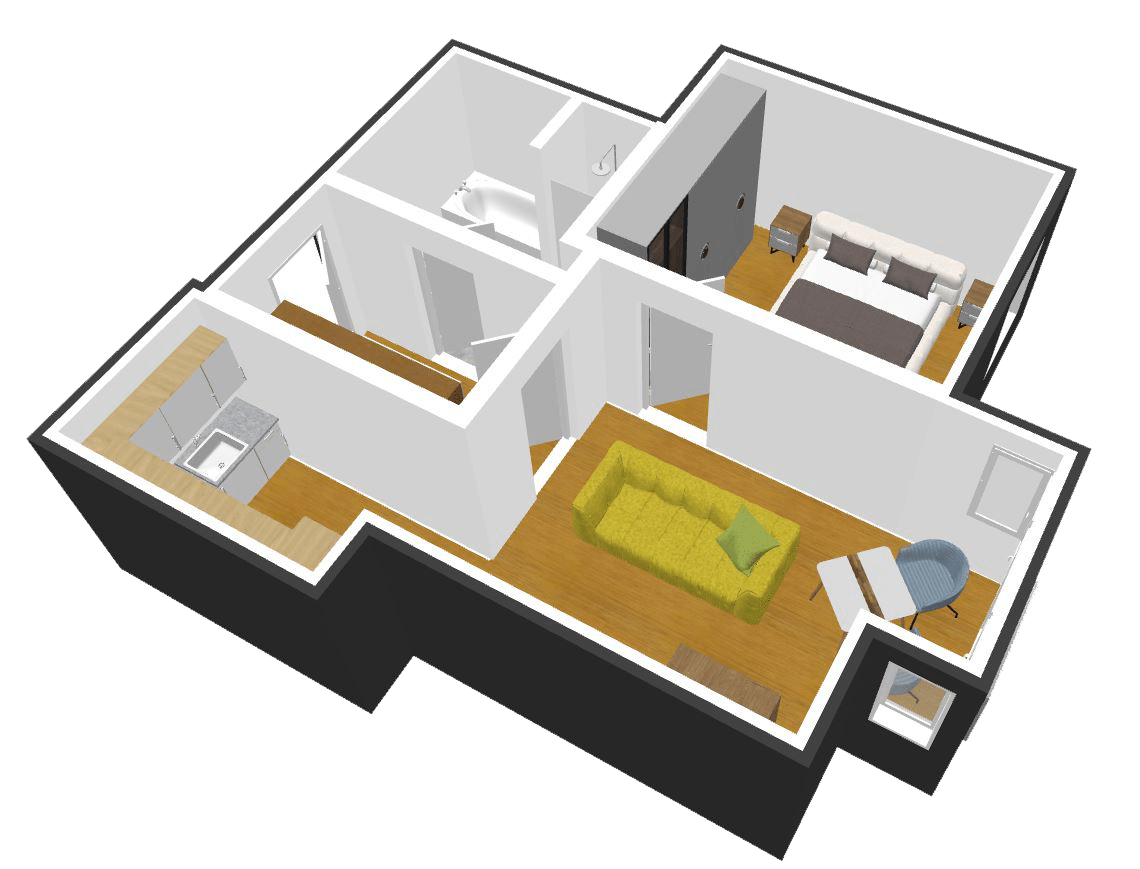 Das separate Schlafzimmer bietet ausreichend Platz für ein Doppelbett sowie zusätzliche Möbel und dient als ruhiger Rückzugsort. Die klare Trennung von Wohn- und Schlafbereich unterstreicht den durchdachten Grundriss der Wohnung.